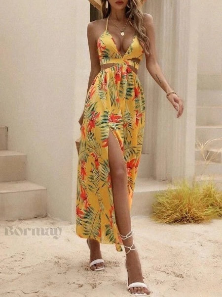 Eileen Jurk met print, open achterkant, vlinderdas en split bij de halslijn